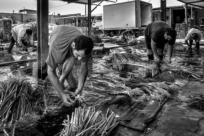 Solo hay silencio, únicamente roto por el trasiego constante de una labor repetitiva pero hipnótica. Los ajos tiernos se recolectan conteniendo gran cantidad de tierra en sus raíces y su proceso de limpieza continúa realizándose por el pequeño agricultor de manera artesanal.