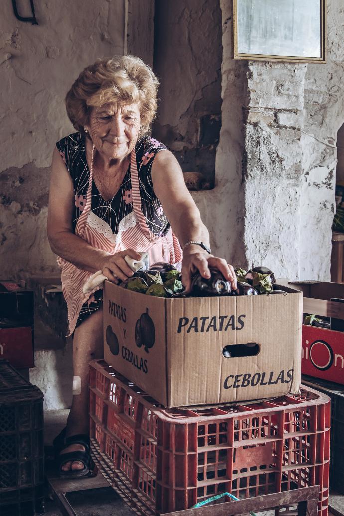 "Me llamo Carmen y toda mi vida ha sido trabajar en el campo. Me casé con 23 años con un agricultor y comencé a ir al Mercado de Abastos a vender. Por desgracia él murió muy joven y tuve que hacerme cargo yo sola de todo, de plantar, regar, cosechar y vender. Con mucho trabajo pude comprar un tractor y algo de maquinaria.