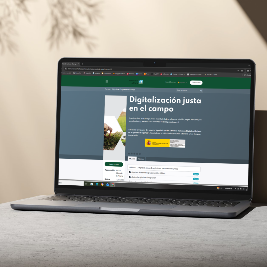 Este proyecto, denominado "AgroTech por los Derechos Humanos: Digitalización justa en la agricultura española" ha sido financiado con 9.157,50 € por el Ministerio de Asuntos Exteriores, Unión Europea y Cooperación. Nº de expediente: 118-032279.